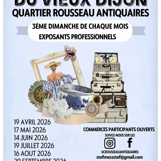 Brocante du Vieux Dijon organisée dans le quartier Rousseau Antiquaires tous les 3ème dimanche de chaque mois.
